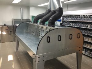 Local de stockage de peinture sur mesure avec tables aspirante également sur mesure, réalisé pour un lycée professionnel en collaboration avec la CARSAT, afin que cette installation soit aux normes.