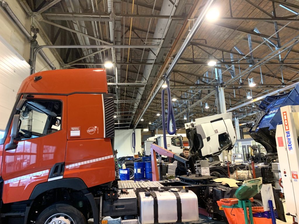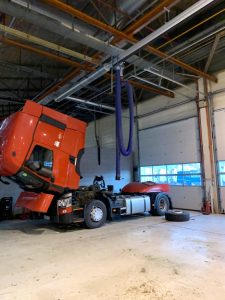 Mise au normes CARSAT d’un atelier PL avec l’installation d’un rail de 45 mètres d’extraction des gaz d’échappement.